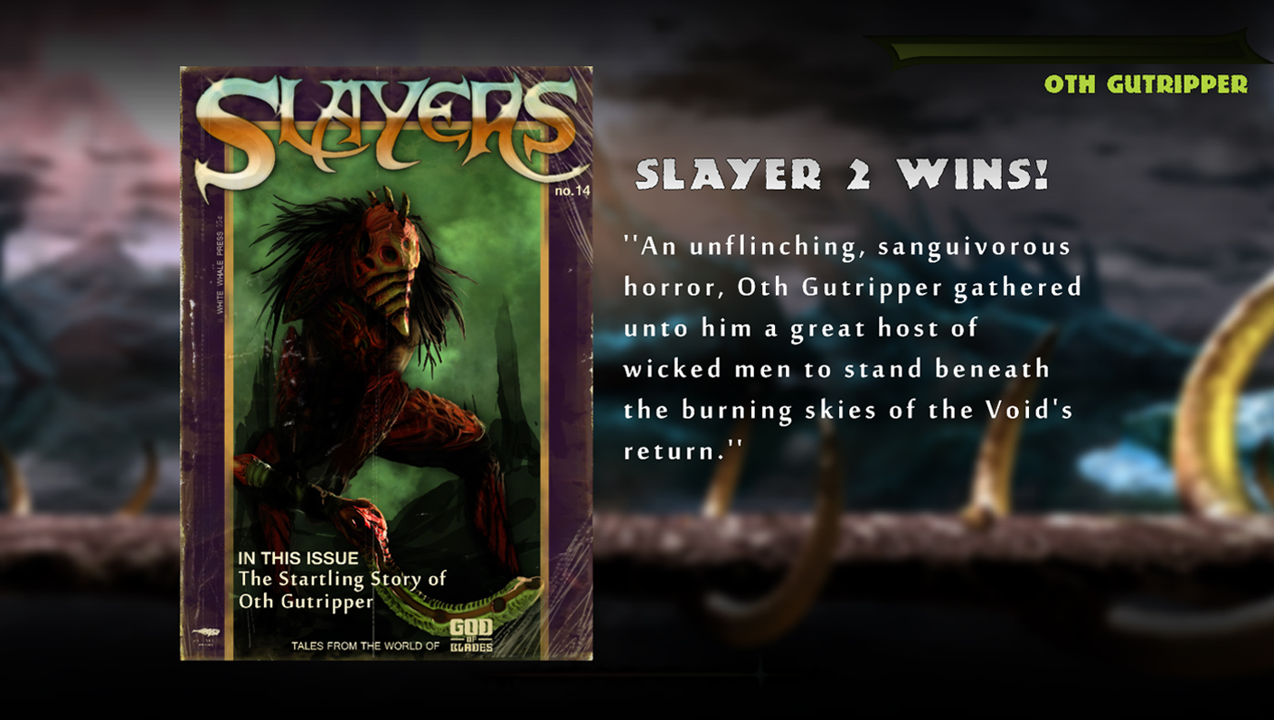 Matches of Slayers are fast, brutal, and gorgeous, and end with a dynamically-generated, period-specific issue of 'Slayers magazine' showcasing the match's acclaimed victor.